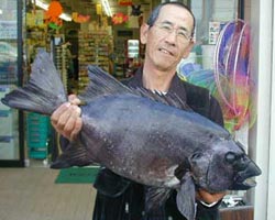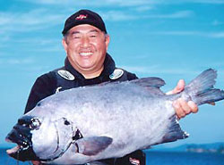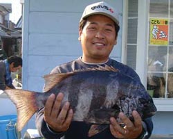 | 11月8日、沖ノ島常連の友安さんは、朝11時ごろに、66cm 4.8kgのイシダイを釣り上げた。エサはバフンウニを使用。 |