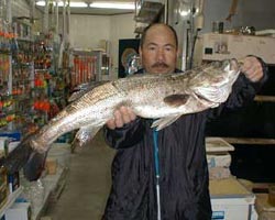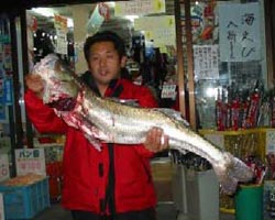 | 11月6日、八幡西区の串田さんは遠賀川河口堰にて、102cm 7.25kgの大型スズキをルアーでゲット! |