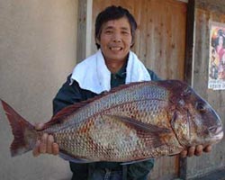 | 11月18日、マダイ狙いで呼子沖に釣行した池さんは、活イカの泳がせ釣りで7.5kgを頭に大型マダイを釣り上げた。 |