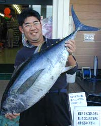 | 11月24日、沖ノ島常連の梶原さんはハリス12号の上カゴ釣りで、125cm 15.5kgのマグロを30分の格闘の末に釣り上げた |