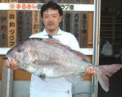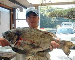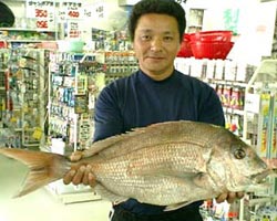 | 5月20日、岩瀬さんは江ノ島にて、94.7cm、9.7kgの見事なマダイを、なんとフカセで釣り上げた。 |