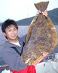 | つり源スタッフの草場さんは5月24日、津屋崎漁港から出船する飛竿屋さんでメバル&イカ釣りに出て、74cm 4kgの大型ヒラメをゲットした。なんと3lb(0.8号)のラインで仕留めたそうです。 |