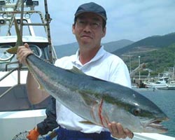 | ゴールデンウィーク、対馬沖のジギングで、大阪府の笠松さんはブリ7.5kgや、マダイ2.7kgを仕留めた。 |