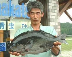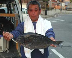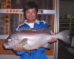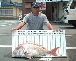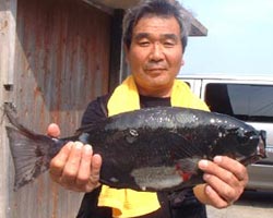 | 6月29日、ゴンヒョウにて西都市の長友さんは、57.5cm、3.9kgのイシダイを釣り上げた。長友さんは、石鯛釣り数回の初心者。この石鯛が初ヒット・初ゲット・それに大物ときて、最高の一日になったそうだ。 |