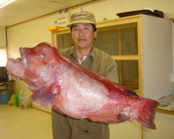| 8月12日、椎葉さんは平島の西の角にて、75cm、6.0kgのフエフキダイを見事に釣り上げた! |