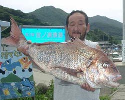 | 8月28日、イシダイ仕掛けに大型マダイが!87.5cm 7.5kgのマダイが上がった。その他、イシガキダイを1匹。エサはバフンウニ。