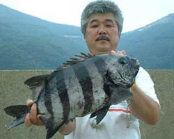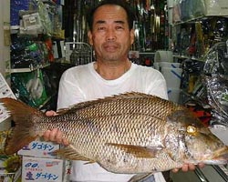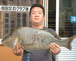 | 8月3日、福岡県からお越しの、鶴亀石鯛クラブ会長・坂本氏は、57.5cm 3.4kgのイシダイを筆頭に、良型イシガキダイなど5匹仕留めた!エサはバフンウニを使用!! |