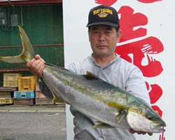 | 8月3日、芦屋沖にて、八幡西区上上津役の島田さんは、アジゴ泳がせ釣りで94.5cm 6.92kgの大型ヒラマサをゲット! |
