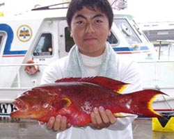 | 8月13日、竹島の夜釣りにて、熊本八代から釣行した高山さん親子は、初めての離島遠征で息子さんが見事なバラハタを釣り上げた。夏休みの良い思い出となった。 |