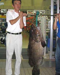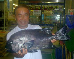 | 9月4日、大分市の浦島会の秋葉さんは深島のツバクロで、34kg 135cmの巨大なアラを仕留めた。えさは冷凍サバ。 |