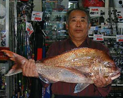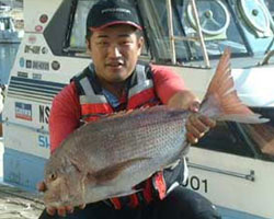 | 9月26日、福岡県からお越しの寺上さんは、77cm 5.3kgのマダイを見事仕留めました!エサは沖アミボイルを使用!