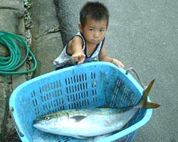 | 9月15日、梅乃家のポーター智明さんは対馬沖のジギングで、見事7.5kgのブリを仕留めました。 |