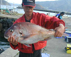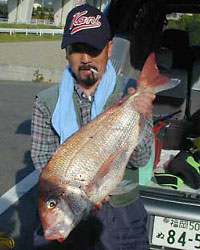 | 壱岐沖に釣行した尾崎さんは、みごと73cm 4.6kgの大型マダイを釣り上げた。 |
