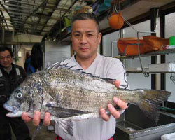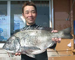 | 4月25日、松本さんは54.5cm 2.5kgの大きなチヌを釣り上げた。 |