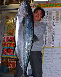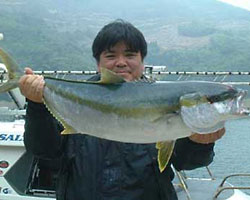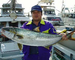 | 4月22日、茨城県からお越しの河島さんは対馬沖のジギングにて、8.5kgのみごとなヒラマサを釣り上げた。 |