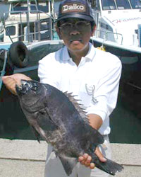 | 7月1日、福岡市の陣内さんは、初崎筏でのダゴチン釣りで、チヌ 55cmを頭に5匹釣り上げた。 |