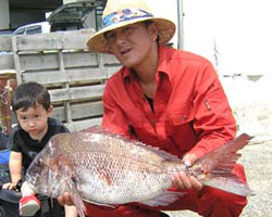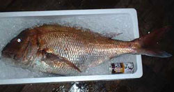 | 7月28日深夜、地元内院の梅野(漁師)さんは夜焚きにて、イカを餌に、84cm 7.8kgの大型マダイを釣り上げました。 |