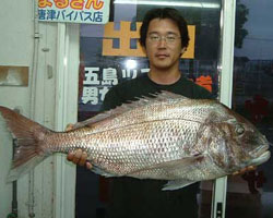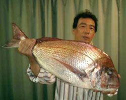 | 7月24日、東松浦郡の三塩さんは古志岐沖にて、92.5cm 9.8kgの大物マダイを釣り上げた。 |