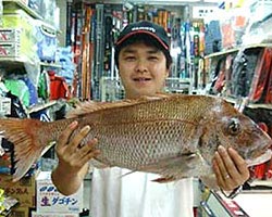 | 9月3日、幸さんは一尺屋のイカダにて、75.0cm 4.4kgのマダイを釣り上げた。 |