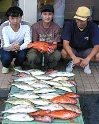 | 9月4日、沖ノ島初挑戦となった山田さん、郷さん、大場さんは、メタルジグで青物を狙い、ネリゴ・ヤズ・アカハタ・アラカブなどをクーラー満タン釣り上げた。