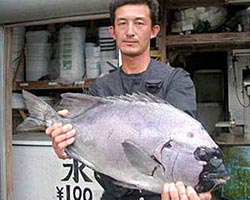| 9月30日、端島にて、長崎市西山町の副島さんは、4.2kgのコロダイを釣り上げた。 |