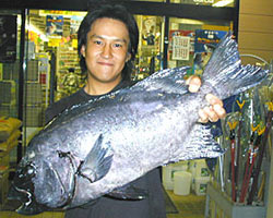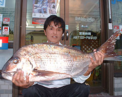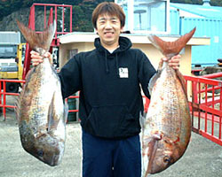 | 11月17日、4kg級のイシダイを2匹釣り上げた呼子の古館さんは10kgのアラも仕留めていました。エサは冷凍サバ。 |