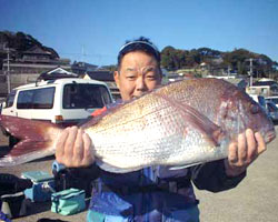 | 11月7日、八幡西区陣原にお住まいのみやび丸船長山口さんは、芦屋沖にて、82cm 7.22kgのマダイをゲット!エサは活きエビ。 |