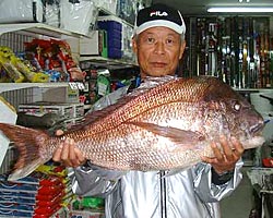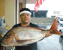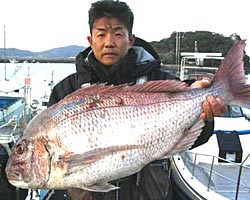 | 12月3日、尾上島にて西岡さんは、82.5cm 7.5kgの大型マダイを見事仕留めました。 |