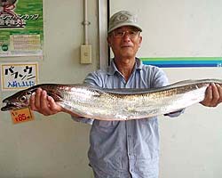 | 8月19日、白浜防波堤内ジギングにて、延岡市の戸田さんは、タチウオ 120cm 1.4kg(指6本)をゲットです!!タチウオジギングはコンスタントに釣果がでています。大きさは指3本平均ですが、4・5本のサイズも多く釣れています!