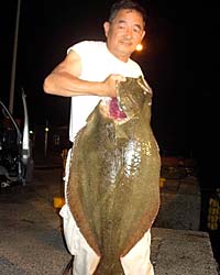 | 8月9日、アジ、イカのリレー釣りで山下さんはタカバや、95cm 8kgの大型ヒラメを釣り上げた |