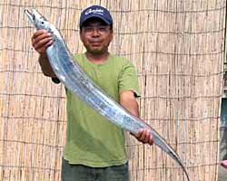 | 8月8日、石川さんは油津港の防波堤から2kgの大型タチウオを釣り上げました。 |