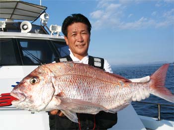 | 8月7日、中川さんは平戸の尾上島で87.0cm 8.0kg のマダイをみごと釣り上げました。 |