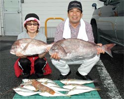 | 9月11日、木本さんご夫妻は、79.0cm 5.9kgを頭にペアでマダイをゲット!なんと伊勢エビのオマケつきでお目出タイ。 |