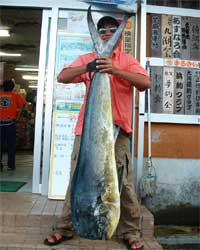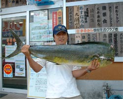 | 9月25日、 近藤さん、舘浦にてシイラ 155cm 17kg の大物を見事仕留めた! |