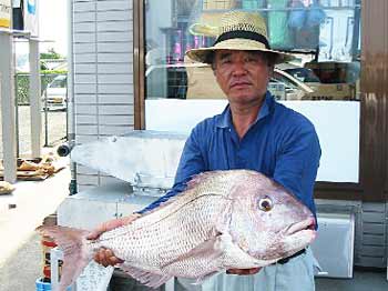 | 9月2日、中間市の植本さんは芦屋沖にて沖アミで、マダイ 85.5cm 7.24kgを見事ゲット!この他に2kgクラスのマダイを8匹も釣り上げる好釣果! |