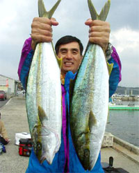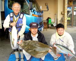 | 11月2日、芥屋漁港から出港する三祥丸で釣行した十和田さんグループは、アジの泳がせ釣りで、8kgの大ヒラメを筆頭に、良型ヒラマサを好釣果!