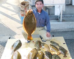 | 11月20日、八幡西区の末延さんは芦屋沖にて、74.0cm 4.5kgを頭にヒラメを好釣果!アジゴの泳がせ釣りにて、3名で合計14匹もゲットです! |