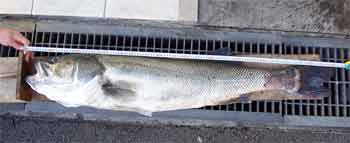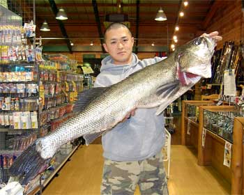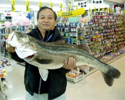 11月27日、大野川河口でルアーフィッシングをしていた井上さんにヒットしたのは拓寸121cm 10kgの丸スズキです。28日の計測時実長でも120cmあり、釣ったばかりで〆る前にはもう3cmくらい長かったそうです。マルスズキの日本記録は122cm。井上さん、幻の日本記録ゲッ〜ト!!