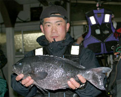| 2月19日、宮城県から遠征の東北西波会の鈴木さんは東海岸の磯にて、51cm 2.0kgの見事なクロを仕留めた。 |