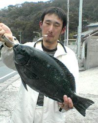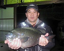| 2月5日、川崎さんは草垣群島下の島にて69,5cm 4.7kgの大型尾長メジナを午前3時半、60cm