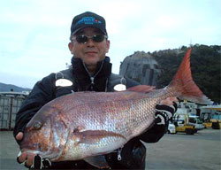 2月25日、男女群島・黒崎鼻にて、井本さんは、82.5cm 7.15kgの大物マダイを竿が折れながらも見事仕留めた!! |