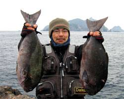 2月18日から男女群島に釣行した、福永(左)さんと中村(右下)さんは、58〜60cmオーバーのオナガを見事釣り上げた。