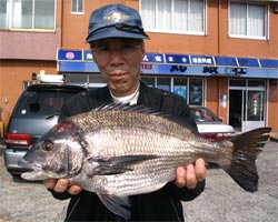 3月26日、前回、4枚の良型チヌを釣り上げた藤田さんは今回も大島に渡り、50,6p 1,88Kgの大型チヌを釣り上げた! |