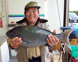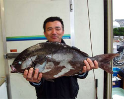 3月11日、男女群島に釣行した「海の会」の松本さんは、61cmのイシダイを見事釣り上げた。 |
