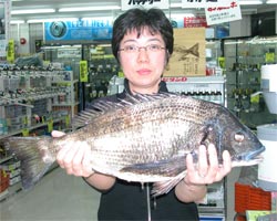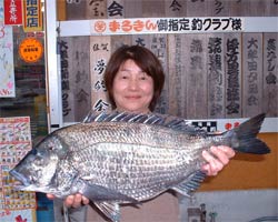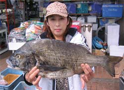3月11日、牛深にて戸村さんは、チヌ 53.3cm 2.5kgを仕留めた。※写真は奥様です。 |