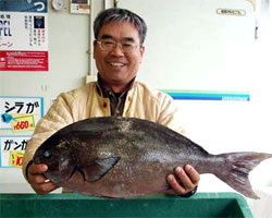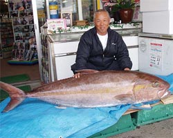 3月25日、山崎さんはトカラ列島諏訪之瀬島沖合にて巨大な記録的大物カンパチ180cm 70Kgをムロアジ泳がせ釣りにて夕方5時にヒットさせ捕獲。同行者の馬渡さんもカッポレ 40Kgクラスを又池水さんも 良型バショウカジキをゲット。船長は泳がせ釣りのベテラントカラ南風丸伊東さんでした。さすがご立派! |