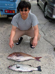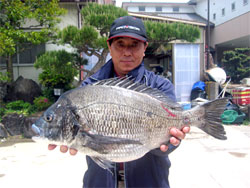 5月4日、大立島に聴講した溝上さんは、良型マダイ、クロ、イサキを釣り上げた。ボイルオキアミでの、フカセ釣りだった。
