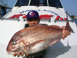 5月6日、沖ノ島にて丸塚さんは91cm、11kgの見事なマダイを釣り上げた。 |