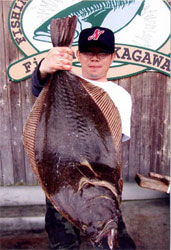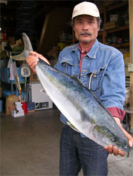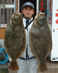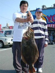 5月10日、富岡沖でのジギングにて、84cm 6.0kgのヒラメが上がっている。 |