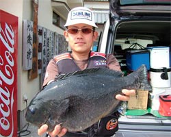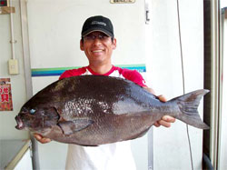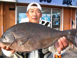 5月29日、南郷水島1瀬にて、酒生さんは午前5時30分にガンガゼをエサに、60cm 4.38kgのイシダイをゲット!